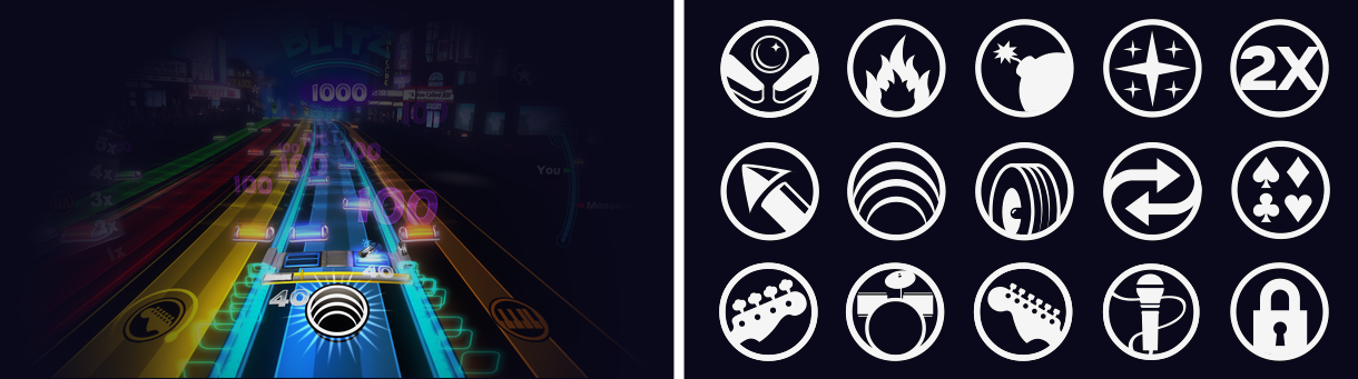 I was brought on to help marry Rock Band’s well-established identity with a more welcoming and accessible arcade vibe. Working with the studio’s Art Director to focus the approach on the logo, my responsibilities grew to include designing the majority of the game’s visual branding, digital marketplace presence, key art, and start screen. Additional contributions included the power up icons used during gameplay and the achievement/trophy icons awarded at the dashboard level.