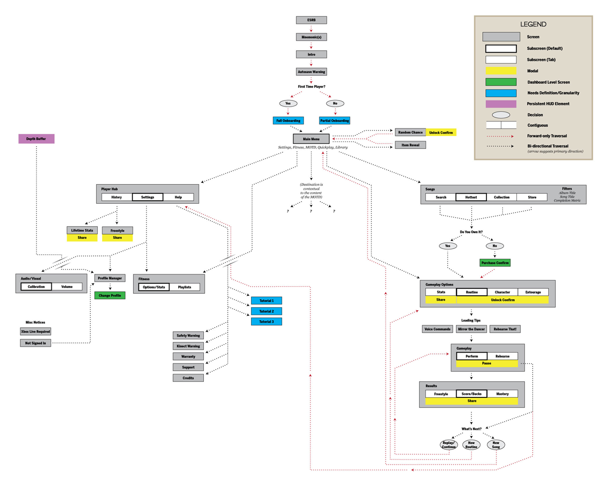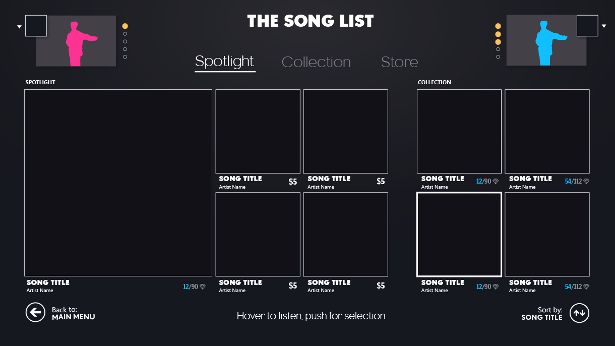 Paired with a small team of UI engineers, we implemented an entirely new interaction paradigm for the franchise in less than 6 months. A new tile-based system was designed to display a higher density of compelling content and unify the visual layer to support multiple modes of input: motion controls, traditional gamepad, and voice. We integrated the players song library with the downloadable content marketplace into a single view, resulting in an increased conversion rate to our ever expanding library add-on content.