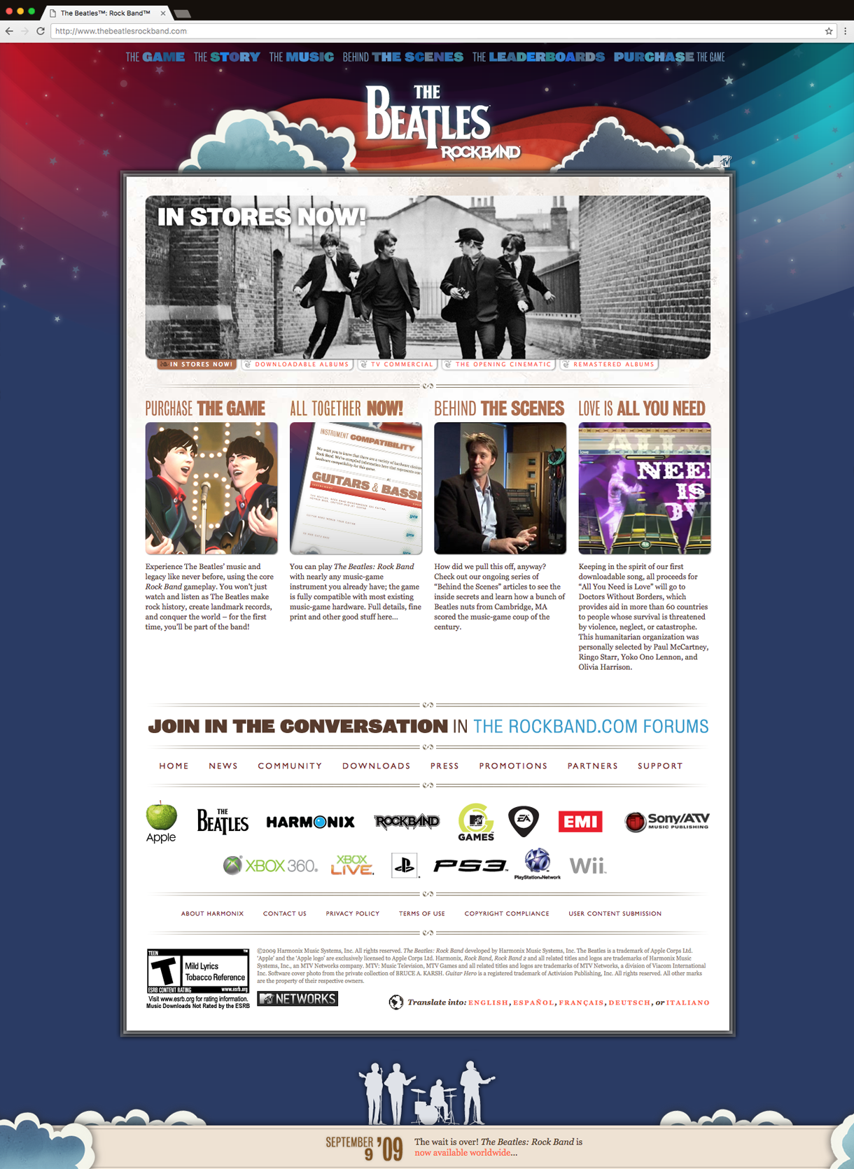The site went live with the launch of the full site on September 9th, 2009, day and date with the game itself. Thanks to the team’s dedication, the end result can best be described as a love letter to the most influential band of all time. In the spring of 2010, after three consecutive years with a nomination, the team’s achievement would be recognized with a Webby Award. Sadly, the site was sunset in 2016 during a consolidation of the Rock Band brand.